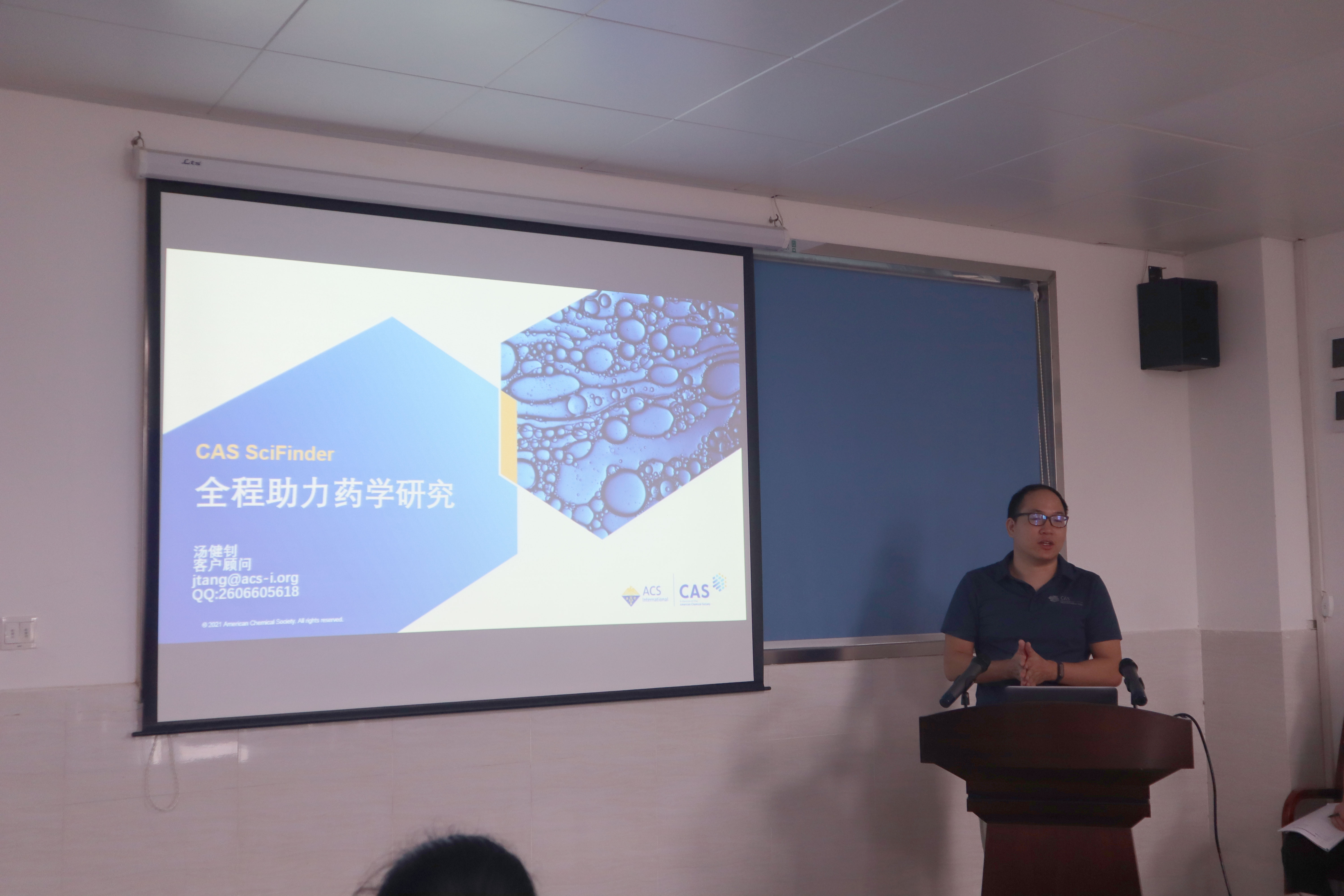 5月27日上午,海洋药物研究院特邀美国化学文摘社北京代表处高级客户顾问汤健钊来鸭脖致知楼D410会议室做专题讲座,讲座题目为:SciFinder助力药学研究。