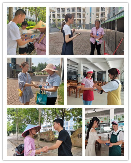 学校安全整洁稳定,离不开在学校基层服务人员,保安人员为确保学校安全稳定,始终坚守在安保岗位;保洁人员为了学校美丽清洁,起早贪黑行走在每条校道;食堂阿姨为了师生饮食安全,严格把关每个程序。为了在炎炎夏日,为这些默默无闻在平凡岗位做不平凡工作的劳动者送一份清凉,一份关怀。基础医学院学生党支部准备冰水、清凉油、小扇子、纸巾等,对仙葫校区保安叔叔、保洁阿姨、食堂阿姨等工作人员进行关爱活动。我们志愿者走向保安点,走进宿舍楼,走向餐厅,走在校道,为这些默默无闻工作人员送上一份清凉,同时还进行夏日防暑防蚊虫以及党史宣传,和他们进行热情沟通交流,更加体会到任何岗位重要性,都要时时刻刻坚守岗位,履行职责和义务。