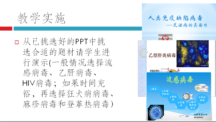 (4)教学实施:学生讲,时间允许学生可讲狂犬病毒等。学生演示→强调重点。