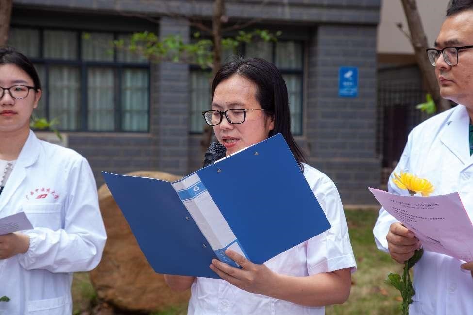 活动伊始,师生们集体重温了医学誓言。随后生理学教研室韦燕飞教授致辞介绍实验动物纪念日的背景和意义:每年的4月24日被确立为“世界实验动物日”,是由英国反活体解剖协会发起、经联合国认可的、国际性的纪念日,旨在倡导科学、人道地开展动物实验。接着,研究生代表和本科生代表分别发表感言,分享自己在进行动物实验时对实验动物的感情及对牺牲的实验动物的感谢。