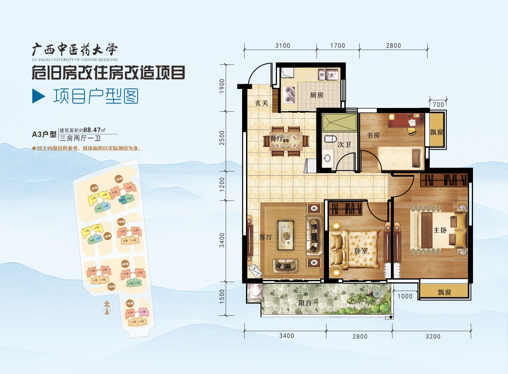 三房两厅一卫(约88.47㎡):1号楼、3号楼(A3户型)