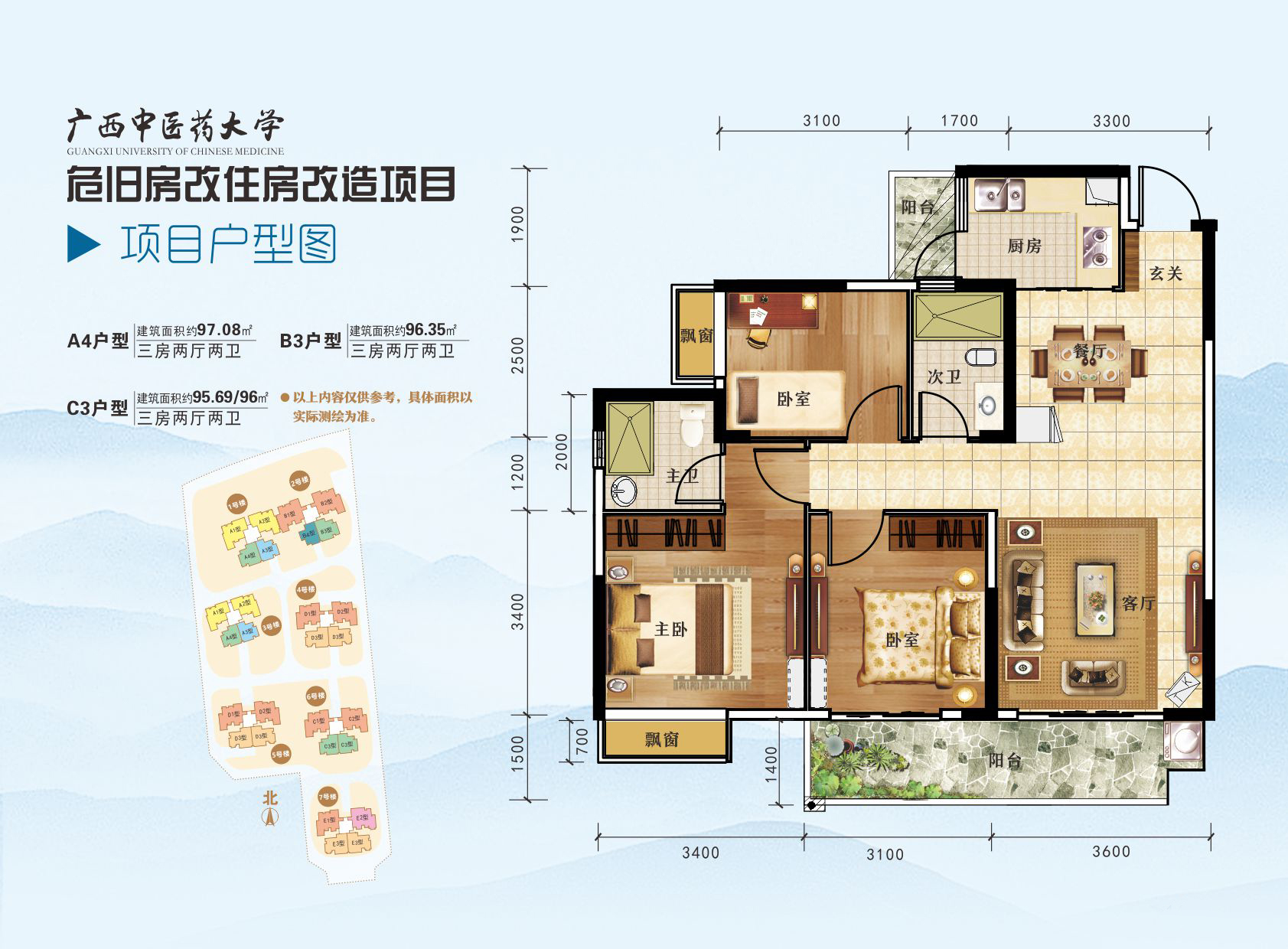 三房两厅两卫(约96.00㎡):1、3号楼(A4户型)、2号楼(B3户型)、6号楼(C3户型) 发布时间:2019-01-30 17:02:15 浏览次数: 次 【字体:小 大】 分享到: 【打印正文】