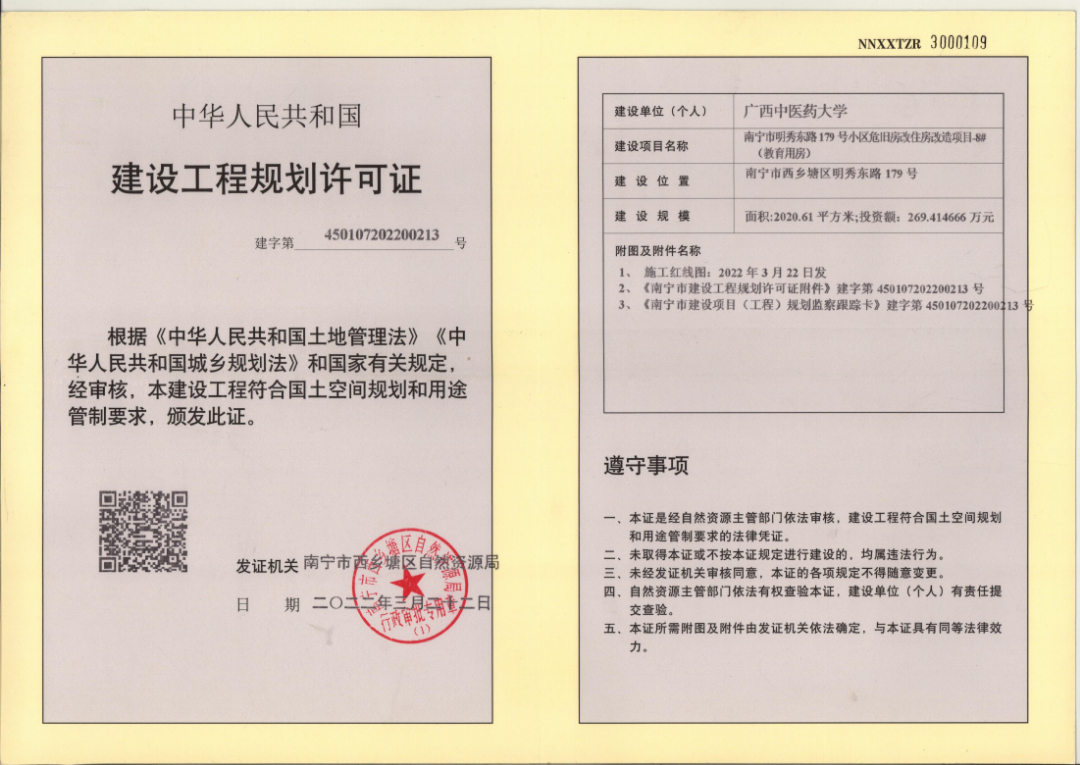 根据项目推进进度及上级主管部门审批要求,2022年1月,鸭脖向南宁市自然资源局递交办理项目回建教育用房建设工程规划许可证申请。经自然资源局审批,项目向自然资源局交纳城市基础设施配套费,并于近日办理取得《建设工程规划许可证》。