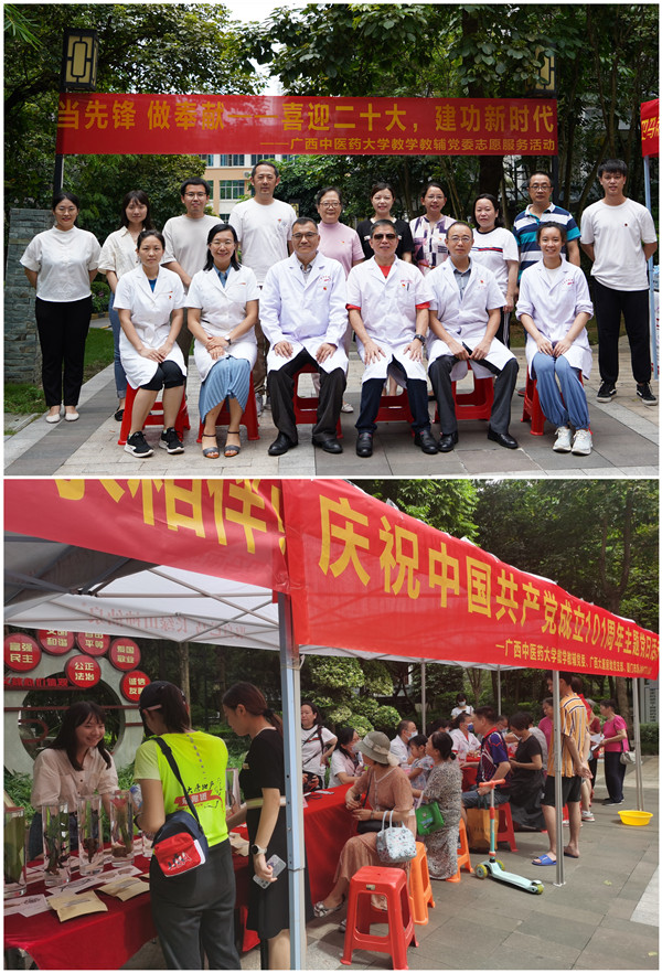 7月2日上午,教学教辅党委到南宁市信地伴云居小区开展了以“当先锋 做奉献——喜迎二十大,建功新时代”为主题的志愿服务活动。通过组织党员义诊、健康咨询、中医药知识宣传、中医健身运动指导、国家非物质文化遗产“壮医药(壮医药线点灸疗法)进社区”等活动,以实际行动践行了“我为群众办实事”,树立了党员先锋模范作用,弘扬了志愿服务精神,得到了小区居民和附近群众的认可和热烈欢迎。