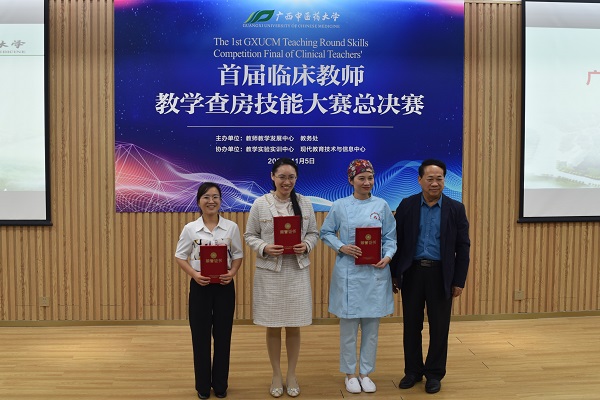 晚上8时,大赛顺利闭幕。学校总督学罗伟生教授、第一临床医学院副院长钟远鸣教授、壮医临床医学院副院长黄国东教授出席闭幕仪式。仪式由教师教学发展中心常务副主任朱珠主持。罗伟生充分肯定了大赛在推动鸭脖临床教师教学能力提升的积极贡献,并提出三点希望,一是希望继续坚持为党育人、为国育才情怀,将立德树人的目标内化于临床教学全过程;二是希望临床教师自觉提高思想觉悟,努力提升临床教学能力,促进临床教师成为“经师”和“人师”的统一者;三是希望全体临床教师立足于中医药领域,坚持弘扬桂中医精神,走中医药教育创新发展之路。