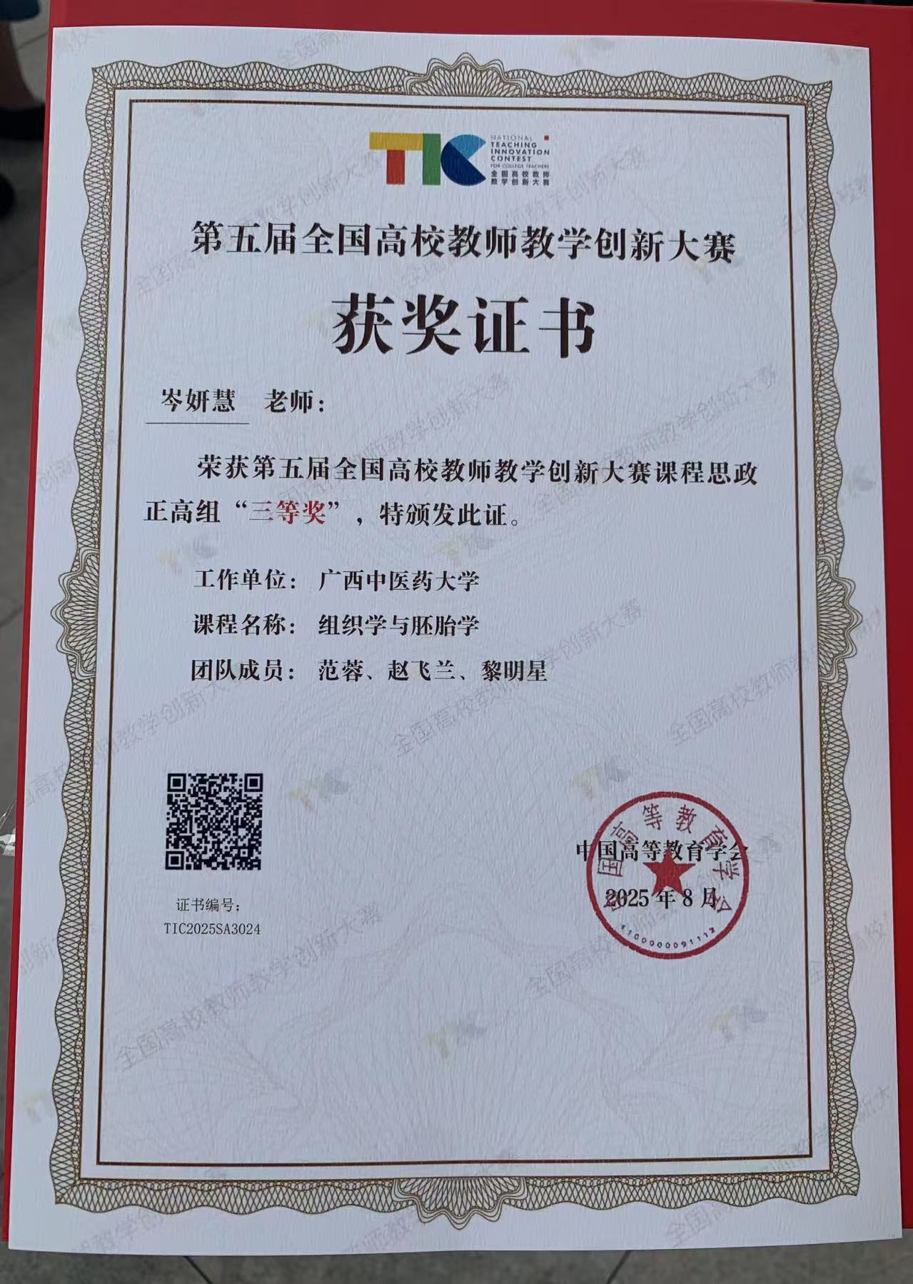 近日,备受瞩目的第五届全国高校教师教学创新大赛全国现场赛在北京理工大学圆满落幕。经过激烈角逐,鸭脖岑妍慧教师团队的《组织学与胚胎学》,荣获课程思政正高组三等奖的好成绩。