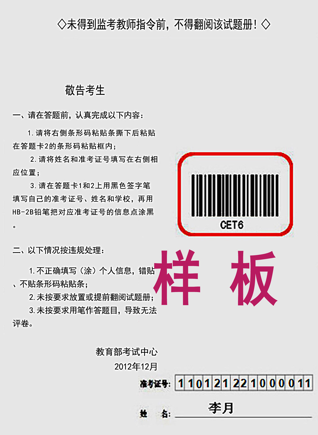 3. CET4在9:40分,CET6在15:40,请考生打开试题册并对试题册印刷质量进行检查,发现印刷质量问题条形码后立即举手向监考员报告,无印刷问题的则仔细阅读试题册背面的考生须知,将试题册背面的条形码揭下后粘贴在答题卡2的条形码粘贴方框内,并在试题册背面指定位置填写姓名和准考证号。未检查出试题册印刷质量问题影响答题的或粘贴条形码错误由考生自行负责。