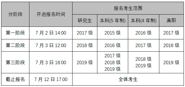 关于组织2020年9月全国大学英语等级考试报名的补充通知 发布时间:2020-07-01 15:43:25 浏览次数: 次 【字体:小 大】 各学院、班级: 2020年9月全国大学英语等级考试将于7月2日14:00起开放报名,为了确保全体同学们顺利报名,避免网络拥绪、缓解报名系统压力,鸭脖依据各年级专业未通过英语四级的情况,制订了分批次报名的方案,请各学院、班级在教务处《关于组织2020年9月大学英语等级考试报名的通知》(2020年6月30日发布)的基础上,参照本方案的时间,组织有报考资质的同学报名,各年级专业报名时间如下: 分享到: 【打印正文】