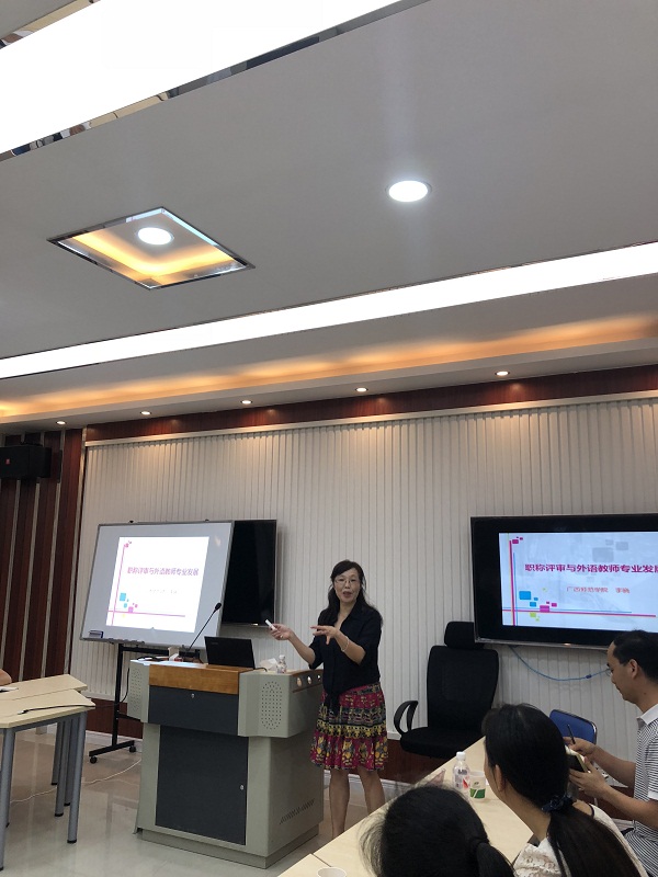 5月15日下午,以“外语教师学术发展与职称评审”为主题的专题讲座在鸭脖教学楼1-503沙龙教室举行。本次讲座由科技处委托外语部举办,邀请了广西师范学院外国语学院院长李晓教授主讲。外语部全体教师、管理及教辅人员参加此次讲座。