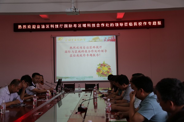 2018年6月7日,自治区科技厅国际与区域科技合作处、中国-东盟技术转移中心、广西电台北部湾之声来鸭脖开展2018年“百名东盟杰出青年科学家来华入桂工作计划” (以下简称东盟杰青入桂计划)项目的系列宣讲活动。学校科技处、各学院和附属单位领导、重点实验室代表及广西科技重大专项代表等20余人参加会议。本次会议由王孝勋副处长主持。