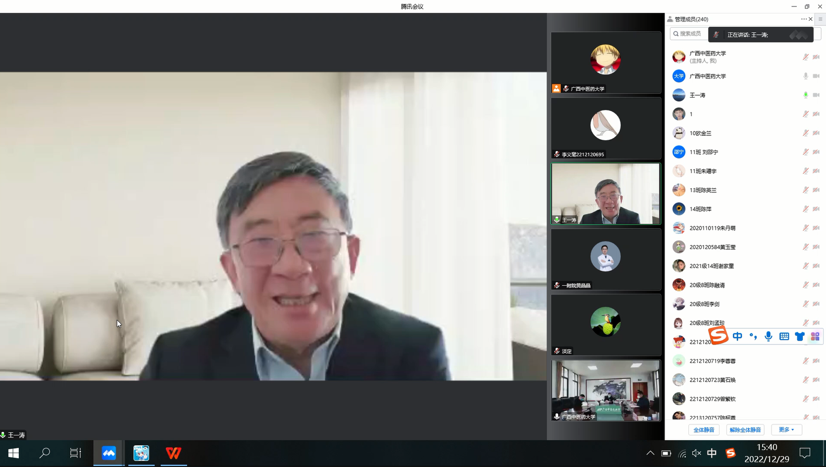 12月29日下午,鸭脖举办2022年中医药传承创新学术讲座。会议采取线上与线下结合的方式,特邀澳门大学讲座教授、澳门中药研发中心主任王一涛教授主讲。学校党委书记莫锦荣,副校长冷静出席会议。学校党委办公室、科技处、各二级单位、教辅部门共1100余名师生通过线上或线下参会。会议由冷静主持。