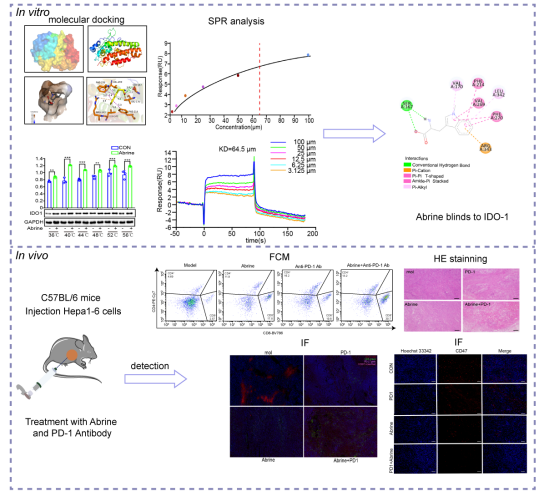 Abrine是“桂十味”中鸡骨草主要成分之一。研究发现,Abrine靶向IDO1抑制JAK1-STAT1信号通路,从而降低IFN-γ和Kyn水平、抑制PD-L1和CD47的表达。此外,Abrine与PD-1抗体联用具有协同抗HCC作用,增加肿瘤组织中CD8+T细胞浸润,降低肿瘤组织中PD-L1和CD47表达,下调Foxp3+Treg细胞,发挥抗肿瘤免疫逃逸作用。为中药联合PD-1等免疫检查点抑制剂治疗HCC提供了新策略。
