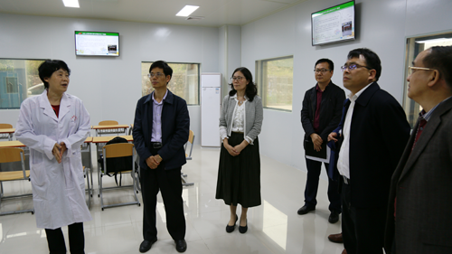 钟会超(左二)在YABO鸭脖副校长冷静(左三)陪同下参观YABO鸭脖石墨烯生物医药应用技术研究院和药学院