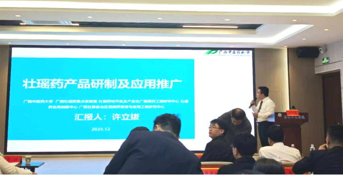我平台受邀参加此次活动,实验室骨干许立拔老师在“高校院所中医药健康及相关领域技术创新成果路演”环节中,围绕“壮瑶药产品研制及应用推广”主题作专题报告。报告系统梳理了我平台近年来在壮瑶药理论挖掘、药材资源开发、制剂工艺创新以及产业化推进等方面取得的研究成果,重点展示了多个具有自主知识产权的中药复方制剂研发项目,涵盖抗炎镇痛、调理脾胃、增强免疫力等多个方向,充分体现了我平台在民族医药领域的科技创新能力与实践转化潜力。