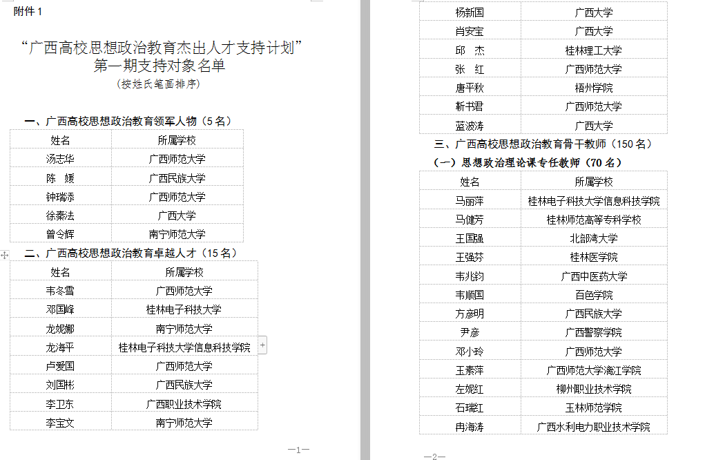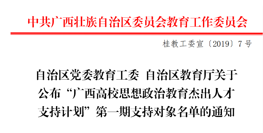 近日,《“广西高校思想政治教育杰出人才支持计划”第一期支持对象名单》(桂教工委宣〔2019〕7号)公布,鸭脖马克思主义学院院长韦兆钧教授、中国近代史纲要教师唐踔研究员两位老师获“广西高校思想政治教育杰出人才支持计划”思想政治理论课专任教师骨干教师第一期支持对象;心理咨询中心谢春艳教授获心理健康专职教师骨干教师第一期支持对象。