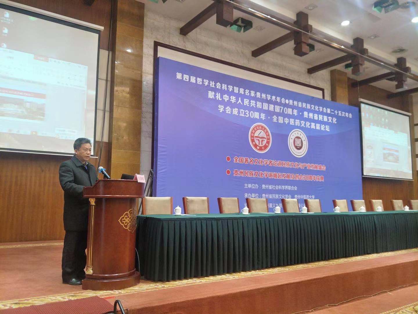 2019年11月30日,第四届哲学社会科学智库名家-贵州学术年会·贵州省民族文化学会第二十五次年会·献礼中华人民共和国建国70周年·贵州省民族文化学会成立30周年·全国中医药文化高层论坛在贵阳召开,自北京、浙江、江苏、湖北、广西、甘肃、云南、贵州等省市区的上百名著名文化学者和中医文化专家汇集贵阳花溪,论道民族文化与中医药文化的发展。此次会议邀请了8名专家做演讲分别来自贵州、北京、湖北、广西,鸭脖马克思主义学院院长韦兆钧作为特邀专家之一参加此次会议并做了演讲汇报。
