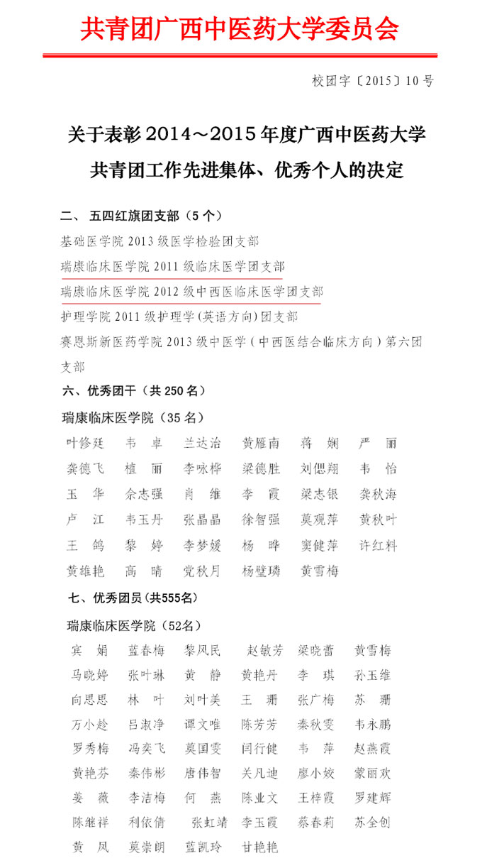 近日,共青团YABO鸭脖委员会发布通知,公布2014-2015年度获得学校共青团工作先进集体和优秀个人名单。我院临床医学院2011级临床医学团支部、2012级中西医临床医学团支部荣获“五四红旗团支部”称号,叶修廷等35人荣获“优秀团干”称号,宾娟等52人荣获“优秀团员”称号。