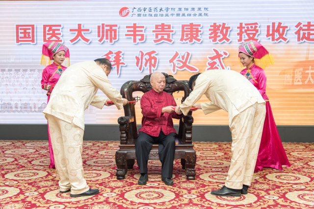 古之学者必有师,师者所以传道授业解惑。会上举行了简朴而庄重的拜师仪式,13名来自世界各地弟子向国医大师韦贵康拜师,并接受国医大师韦贵康教授回礼葫芦和书。韦贵康国医大师希望弟子们学富五车、悬壶济世。