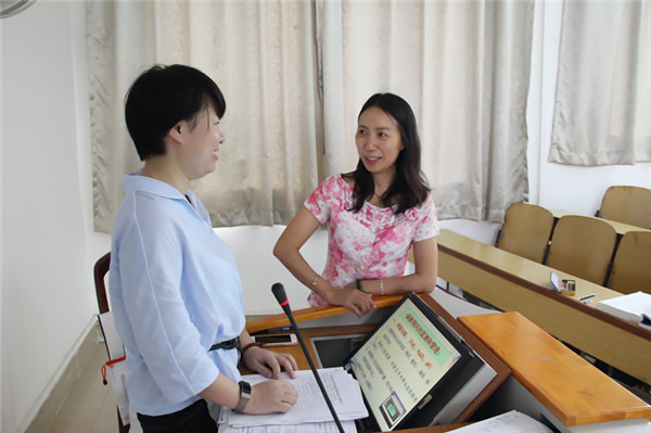 在课间休息时,陈日兰副书记、副院长与上课老师进行交谈