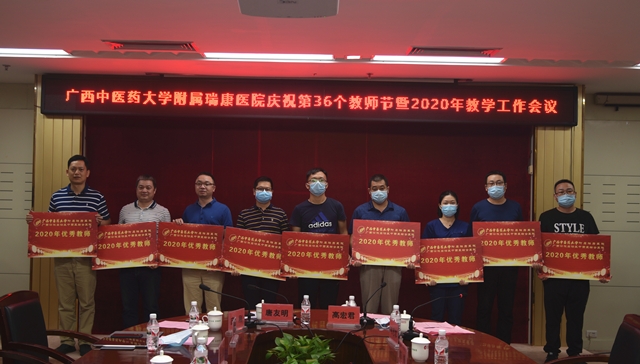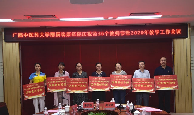 韦思尊宣读表彰文件。与会领导逐一给2020年优秀教师、教学管理工作者,以及2019年度住培优秀责任导师、优秀带教老师、优秀科室主任、优秀住培管理工作者颁奖。