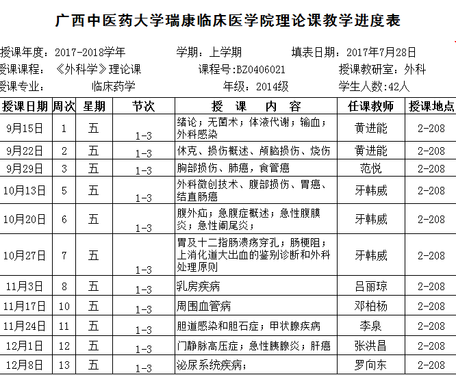 14级临床药学《外科学》理论课表