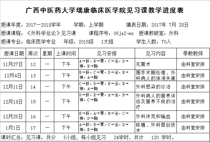 2017-2018上15级临床第1大组《外科学总论》见习进度表
