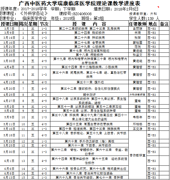 2017~2018下15级临床医学专业2组《外科学各论》理论课表