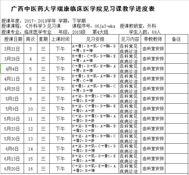 2017-2018下15级临床第4大组《外科学各论》见习进度表