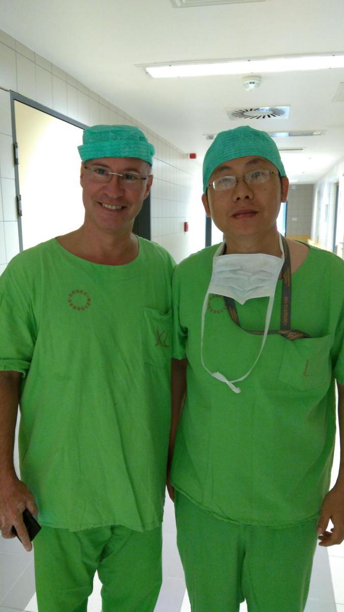 医生在查房时十分尊重患者,耐心解释病情,态度和蔼,而病人则给予医生充分尊重和完全信任,依从性高,令人印象深刻,从没有遇到过患者或者家属质疑甚至阻挠医生的治疗方案,医患关系和谐融洽,这与中国医闹不断的现实形成鲜明对照。在每周周五早8点至9点会按计划安排一名教授进行主题讲座,主要针对实习生。我最敬佩的大外科主任Damjanovich教授在国内相当知名,擅长各种普外科手术,但腹腔镜手术相对操作较少,他经常在术中用英语给我讲解手术,并时常向我探询中国的手术处理方式。还有胃肠外科Tanyi教授的手术操作非常娴熟,动作精准流畅如行云流水,无论是传统开放手术还是腹腔镜手术都游刃有余,参观过程相当享受。术后我向他表达我的敬佩之情,他非常高兴,并在之后邀请我去他家参加家庭晚宴令我大为感动。学习结束前科室又专门为我安排了一次小讲课,并颁发纪念品以及签名留念。