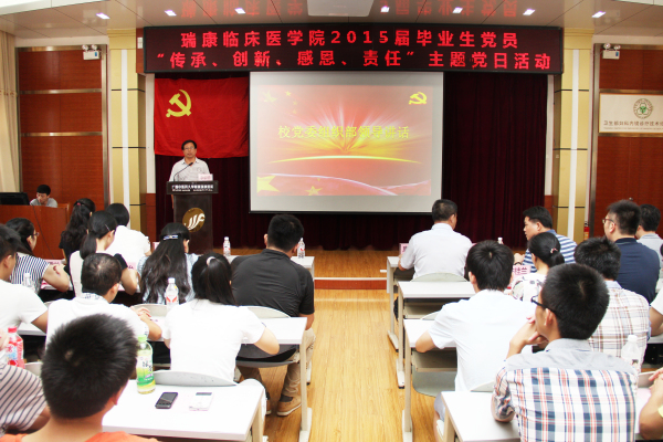 在中国共产党94岁生日即将到来之际,在学校毕业生将走出学校、走上工作岗位的日子里,2015年6月16日下午,我院在10楼教室举行2015届毕业生党员“传承、创新、感恩、责任”主题教育活动,学校党委组织部李中华部长应邀出席主题教育活动并作重要讲话,瑞康临床医学院党委书记唐友明为学生党员作主题教育讲座,党委副书记、纪委书记陈日兰主持会议,瑞康临床医学院教务学生党总支全体老师、178名学生党员及14名学生新党员参加了主题教育活动。