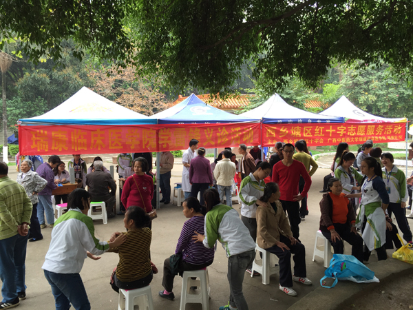 为发扬雷锋无私精神,燃烧青年大学生奉献热情, 3月27日上午,瑞康临床医学院组织40名来自中西医、临床专业的同学到南宁市明秀小区举办“学雷锋义诊活动”。我院骨伤科龚德飞医生与团委副书记、辅导员黄雁南老师参加了本次义诊活动。