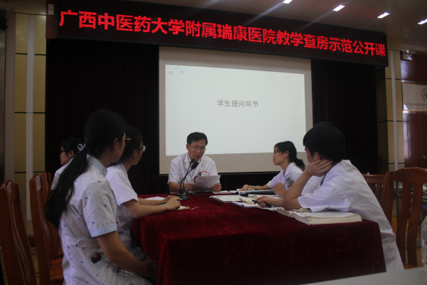 为进一步规范我院实践教学活动,提高实践教学质量,更好地推进临床医学专业认证工作,我院于2016年10月14日下午组织开展了教学查房示范公开课。会议邀请了附属三〇三医院、附属桂林医院、广西民族医院的教师代表参加,我院党委副书记、纪委书记陈日兰及医院各临床科室主任、副主任、教学秘书、教师代表、2012级临床医学专业全体实习生参加会议。