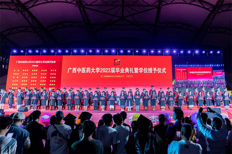 六月的桂中医校园处处青春盎然,大雨过后,彩霞满天,映衬着毕业生们英姿勃发的面容。6月26日晚,YABO鸭脖2023届毕业典礼暨学位授予仪式在仙葫校区运动场举行。学校党委书记莫锦荣,党委副书记、校长姚春,党委副书记庞宇舟、何并文,副校长冷静,纪委书记覃宇环,总会计师何刚亮出席典礼,各部门、各学院负责人、辅导员、教师,全体2023届毕业生、家长代表等参加典礼。何并文主持毕业典礼。