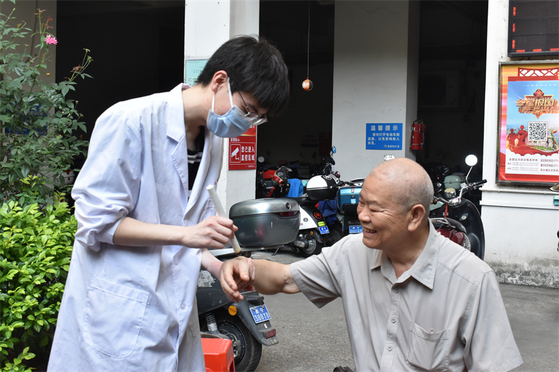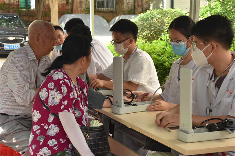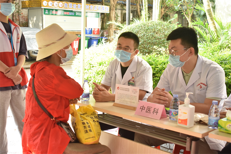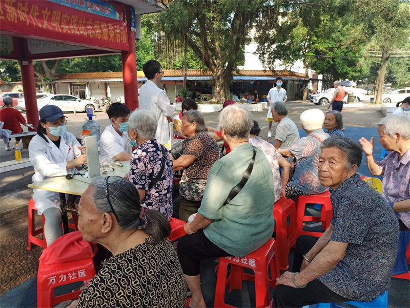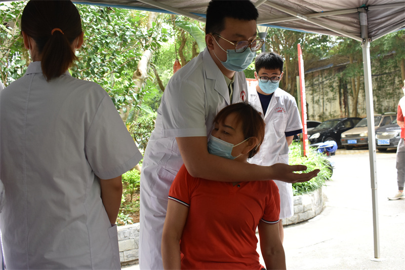 当天上午,义诊团队分批前往万力社区和衡阳南社区同时开展义诊活动。在衡阳南社区,治未病中心闫金星医师、泌尿外科张鑫医师等专家们为到场的社区居民提供医疗咨询服务,热情解答群众提出的常见病、多发病、老年病等健康问题,讲解相关疾病的日常保健和预防知识,提供健康饮食和用药指导,为群众答疑解惑。同时现场还设有手法按摩、量血压、急救知识宣讲等项目,让社区居民在家门口就能享受到专业的服务。在万力社区,志愿者们向现场的居民宣讲了心肺复苏和人工呼吸等方面的健康科普知识,提高居民的健康意识,倡导健康的生活方式,受到社区居民的欢迎和赞誉。