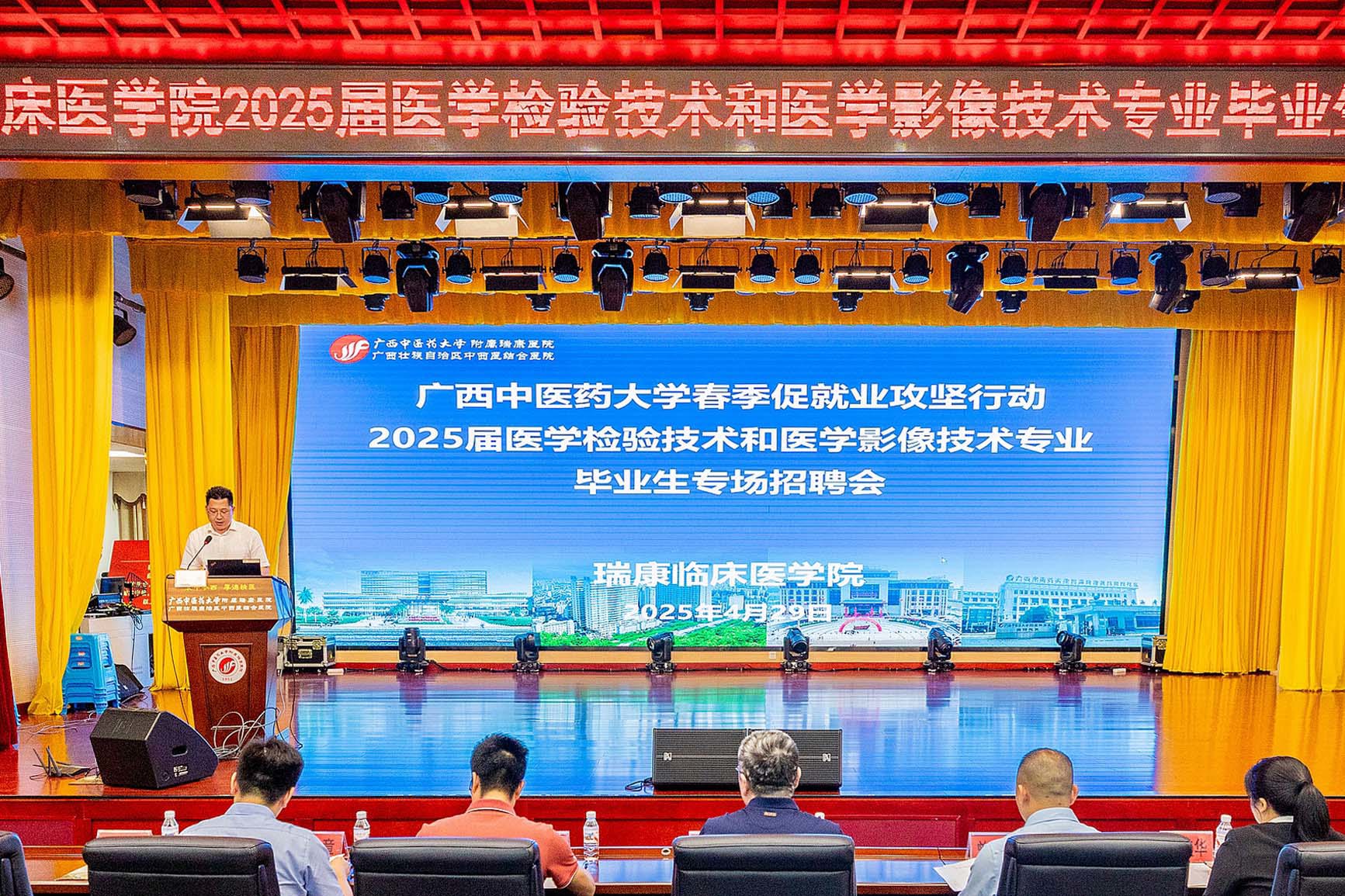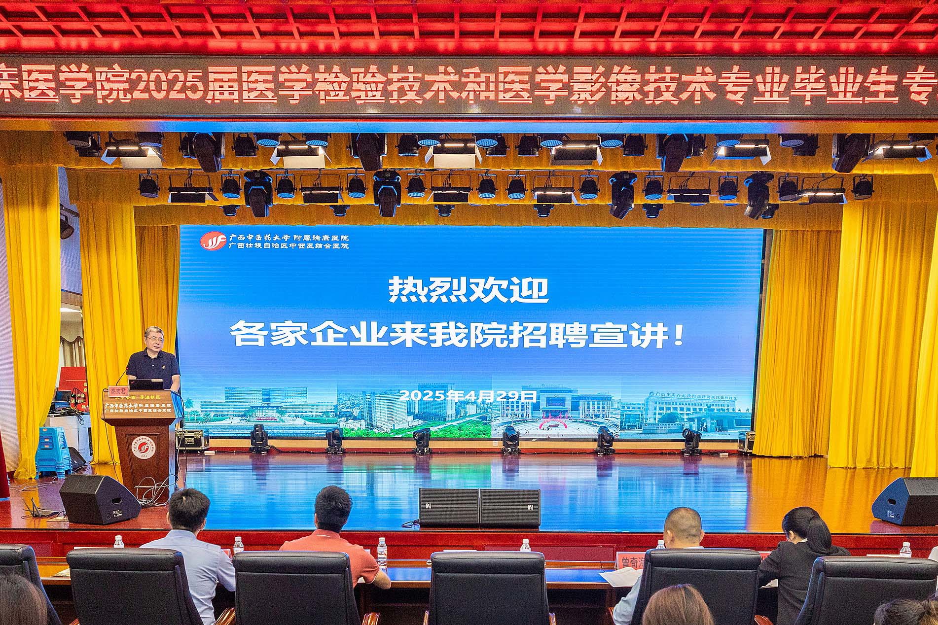 为促进我院2025届医学检验技术和医学影像技术专业毕业生高质量就业,4月29日下午,我院在B座十楼学术报告厅举办了2025届医学检验技术和医学影像技术专业毕业生专场招聘会。学校招就处副处长丁天全,医院党委书记高宏君、党委副书记王德胜、纪委书记彭定基出席会议,检验科、学生科、医学影像科负责人,深圳迈瑞南宁分公司、广西北部湾创新投资有限公司等9家企业代表以及150余名2025届毕业生参加会议。会议由王德胜主持。