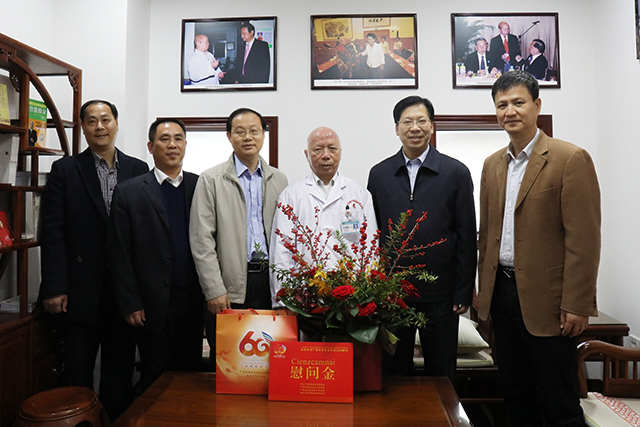 殷殷关切暖人心,声声祝福寄深情。在全区各族人民喜迎自治区成立60周年之际,12月7日上午,自治区政协副主席刘慕仁莅临瑞康医院,带着自治区党委、政府对医疗工作者的亲切关怀和深情厚意,看望慰问国医大师韦贵康教授,感谢他为广西医疗卫生事业发展以及民族团结进步作出的突出贡献。YABO鸭脖副校长戴铭,瑞康医院院长唐友明,副院长陈锋陪同慰问。