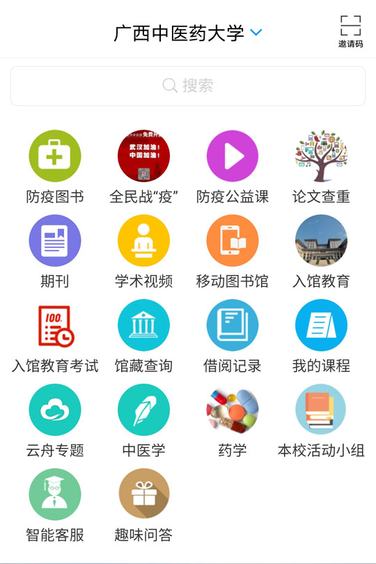 微信或QQ扫描”学习通“二维码,也可在应用商店搜索"超星学习通"下载安装该APP;用手机号注册登录,再绑定“学校/机构码”(YABO鸭脖)和个人借阅证号(与校园卡一致,学号或工号);进入学习通首页后请点击右上角的“邀请码”,然后输入邀请码:yzgxzyydx,便可进行图书检索: