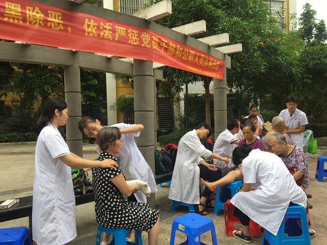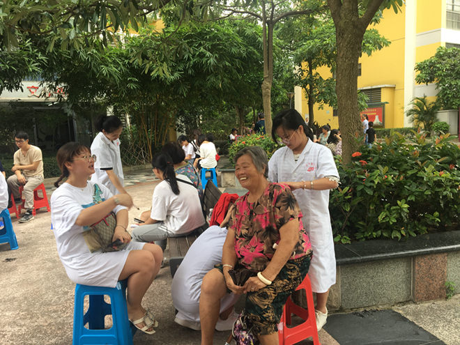同学们为居民做艾灸与进行手法推拿
