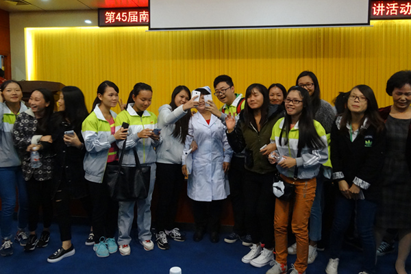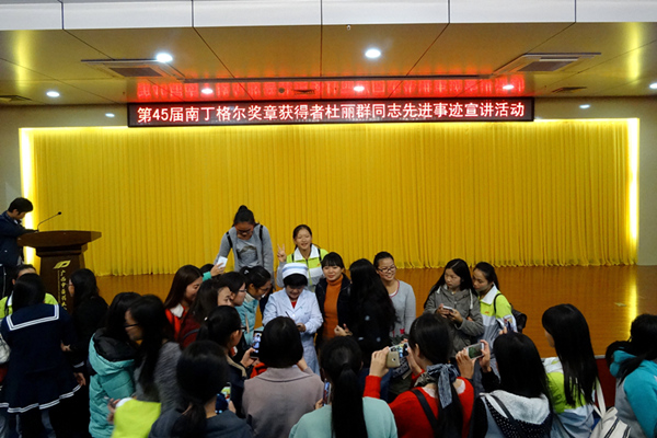 11月27日,南宁市第四人民医院艾滋病科护士长、全国“五一”劳动奖章、全国“三八”红旗手、白求恩奖章、南丁格尔奖获得者杜丽群先进事迹报告会在鸭脖仙葫校区举行。