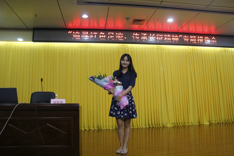 报告会上,刘欣然同学讲述了自己在重走长征路途中遇到的种种困难,分享了自己的心路历程,并向现场的老师和同学们展示了照片。刘欣然说,他们的重走长征远没有当年长征的难度,但是当她经历了吃生米、爬雪山等一系列还原长征生活的体验之后,她对长征有了更深刻的认识,也有了更强烈的想要了解长征的欲望。