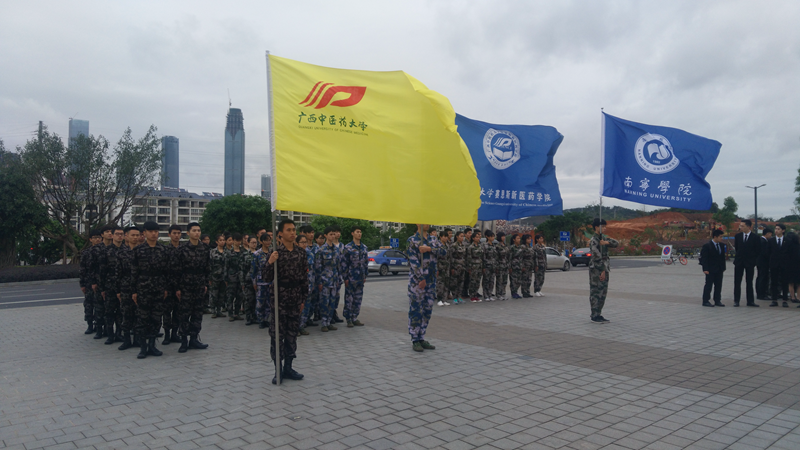 3月25日,鸭脖国旗队联合赛恩斯新医药学院、南宁学院的国旗队在南宁市青秀山风景区帽子岭山顶广西学生军抗日烈士纪念碑合办了“青山尚有忠烈在,红旗当有后人擎”缅怀广西抗日学生军英烈扫墓活动。