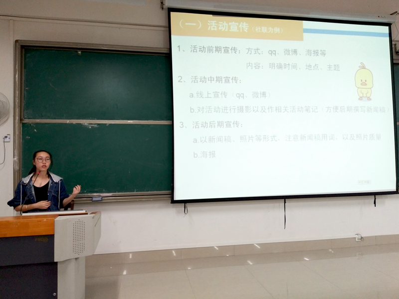 本次培训会分为办公室、项目部、宣传部、信息部、外联部五大分会场,每一分会场都由社联委员按工作职能对社团理事进行相关技能培训。培训过程中,主讲人通过PPT讲解并结合自身工作经验为与会人员传授心得并解答疑问。