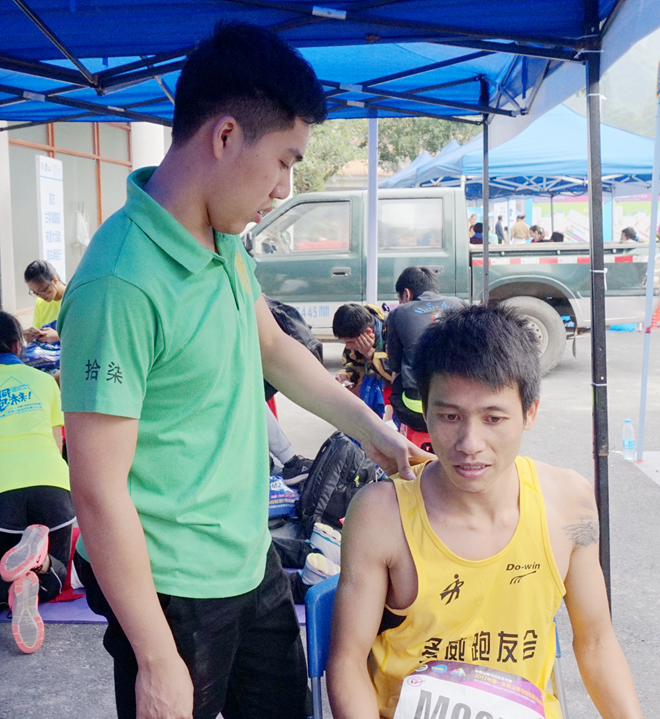 手协的伙伴们一对一地给参赛者进行赛后拉伸,按压等放松手法,还配合进行揉法、拿法、滚法、点法、拨法等手法按摩。为了使运动员能够得到更好的服务,手协伙伴们还做了传统中医治疗方法——踩跷。踩跷疗法是用双足节律性踩踏施术部位治疗疾病的方法,与其他的按摩手法相比,踩跷法具有作用力大、接触面积广、受力均匀、渗透性强等特点。经过一天的辛苦服务,运动员们对手协伙伴们赞叹不已,他们表示,“很感谢手协的同学们给我们提供这么棒的按摩服务,他们辛苦了。”