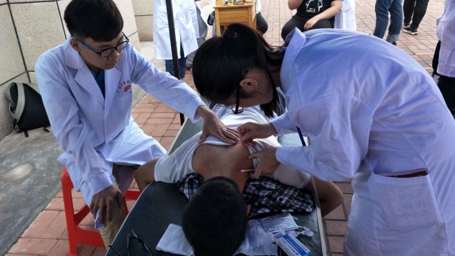 正值鸭脖举办第二十九届校运会,几位刚刚结束激烈长跑的运动员来到我们的活动场地进行全身按摩。15级的学长给针协的同学们做了示范,经过学长的指导,同学们的按摩手法进步很大,运动员们一致表示很享受同学们的按摩。除了手法按摩,我们还提供了拔罐、刮痧和量血压等义诊项目,还有针刺加艾灸,两者合用,消瘀散结,温通筋脉,效果极佳,能够帮助剧烈运动后的同学们疏通筋脉。