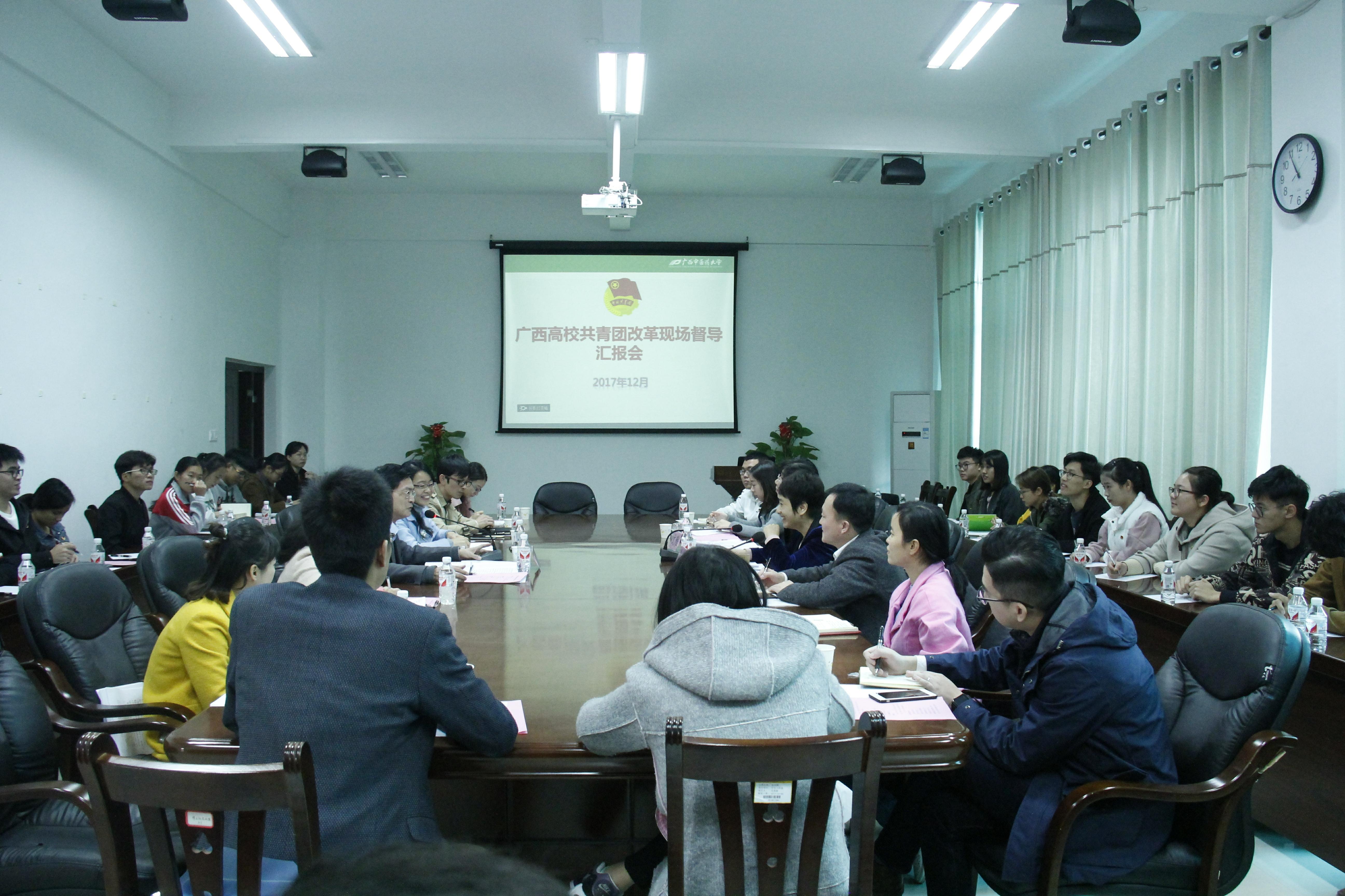 2017年12月11日上午,广西高校共青团改革第三督导组到鸭脖进行现场督导工作,督导组成员自治区高校工委副书记覃萍、自治区高校团工委副书记李晓东、自治区团校教师文雅在仙葫校区大学生活动中心317会议室听取鸭脖汇报工作并召开座谈会,学校党委副书记何并文、学校团委书记王春花及学校全体专兼职团干、团员青年代表参加了本次会议。会议由校团委书记王春花主持。