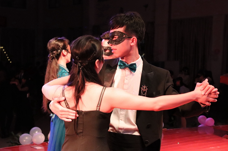 舞会开始前,男生女生结伴在小礼堂进行交谊舞现场教学。现场的同学各个带着面具,不认识彼此,在节拍中彼此融合,不久同学们的舞步逐渐熟练。
