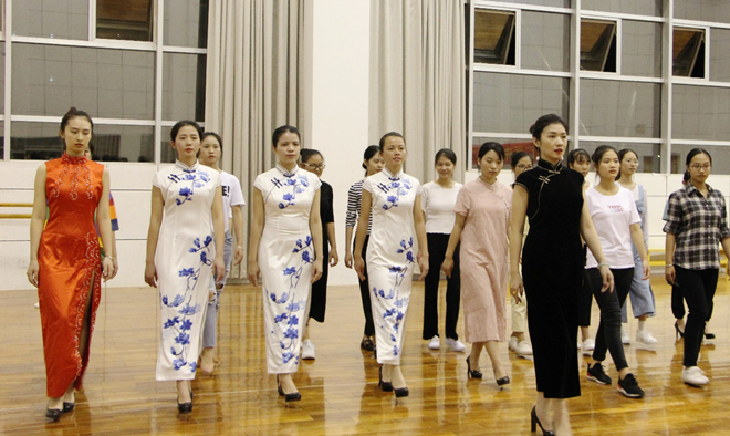实操课部分,秦佳颖老师为同学们展示了身着旗袍时正确的站姿和走姿,体现了东方女性所特有的优雅的美,教会同学们站时要正视前方、眼神不要漂、抬头、收颌、挺胸、提臀,保持一种身体向上拔高的姿态,做一个有自信的人。