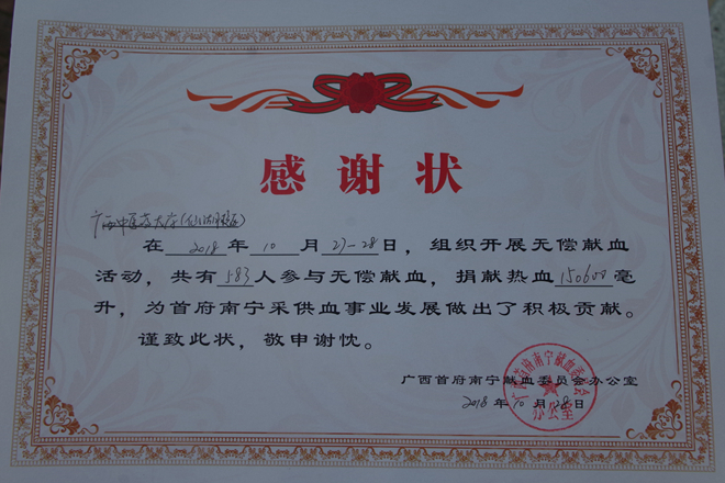 2018年10月27至28日,鸭脖红十字会联合南宁中心血站开展了以“你我付出,牵动他人”为主题的无偿献血活动,共计583人参与其中,捐献热血达150600毫升。