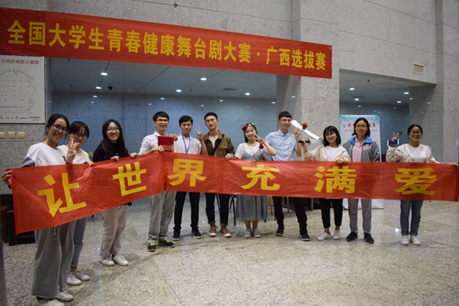 27日,同伴十一名同学参加了由自治区计生协主办的“中国计生协全国大学生青春健康舞台剧大赛广西选拔赛”。比赛于当天晚上在广西医科大学图书馆演讲厅正式开始,共有七个中标高校前来参赛。同伴作为桂中医代表队演出,在将近一个半小时的比赛中,以总成绩与一等奖仅相差0.27分位居第二名。