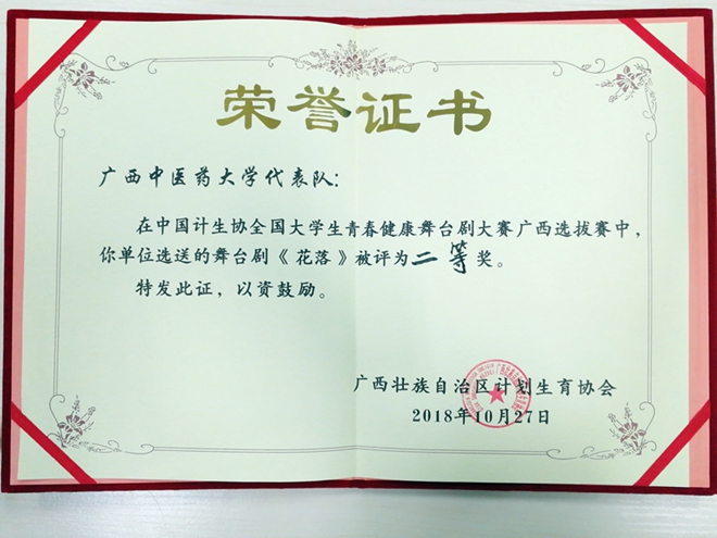 鸭脖青年同伴教育中心自编节目《花落》舞台剧获中国计生协全国大学生青春健康舞台剧大赛广西选拔赛二等奖